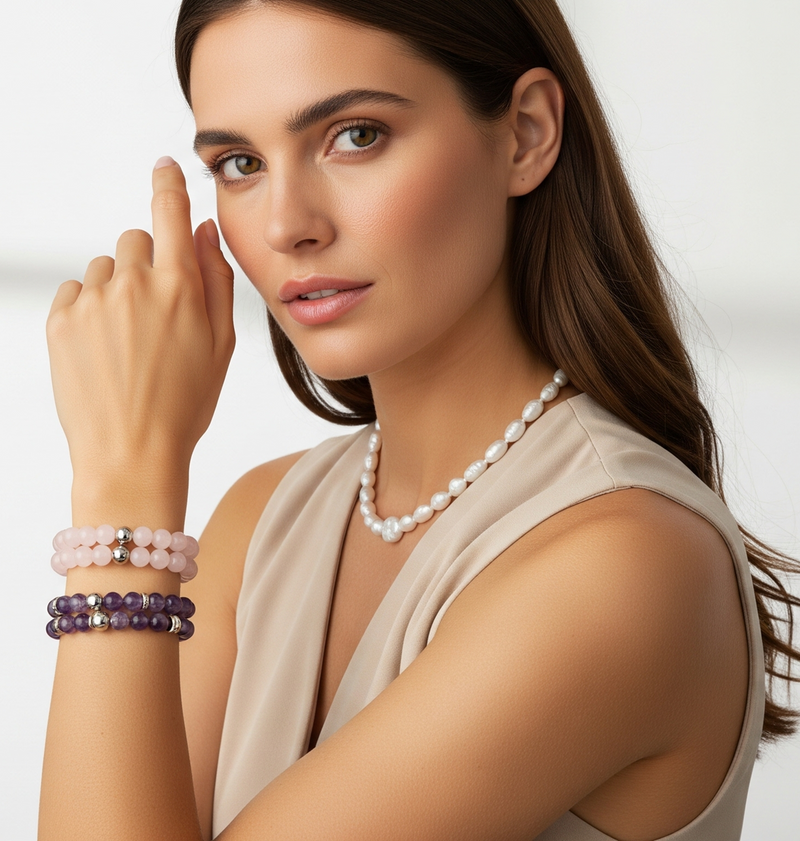 Bracelet "Harmonie" en Améthyste et Quartz rose 4mm